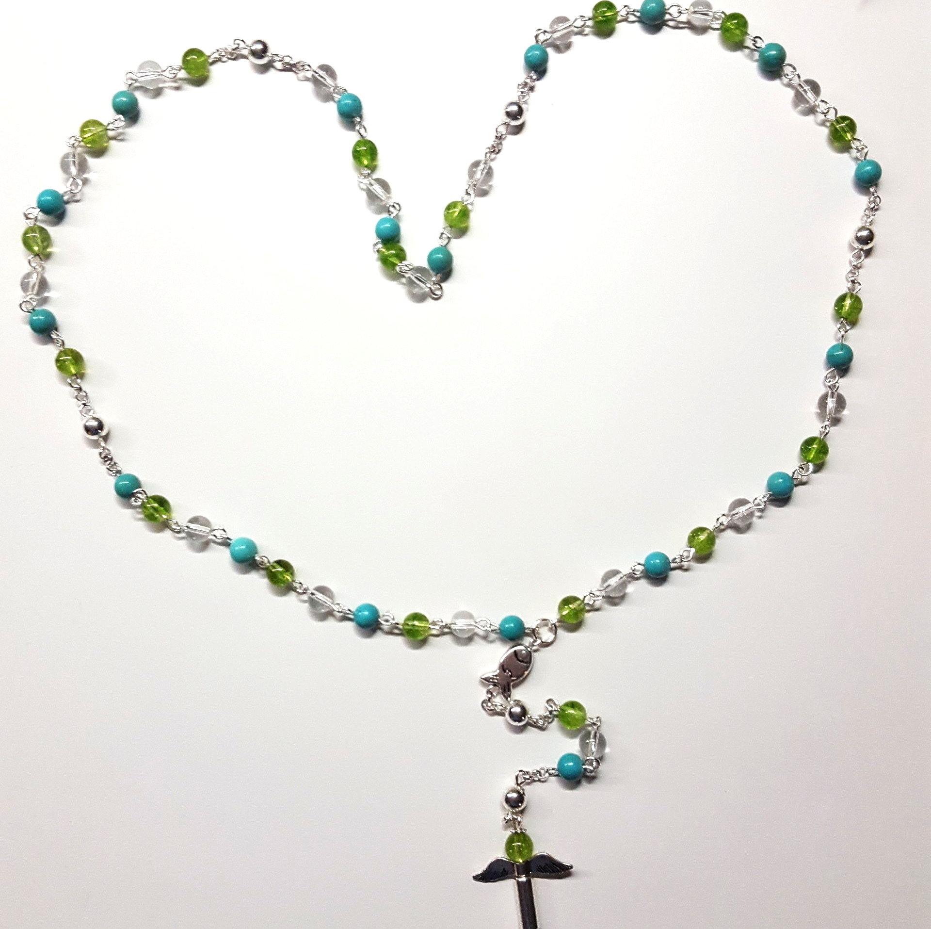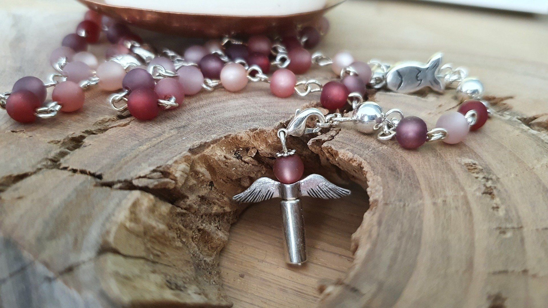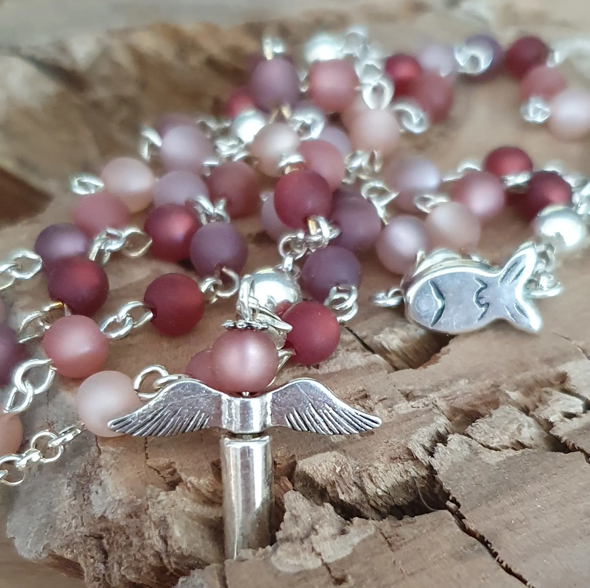 mit zwei kleinen Karabinern an, dann können Sie das untere Stück der Gebetskette abnehmen und nur den kleinen Engel in Kreuzform anhängen. Ihr Rosenkranz lässt sich so als Kette tragen und ist immer bei Ihnen. Oder sie tragen nur den kleinen Engel an einer feinen Silberkette. Eine Auswahl an Silberketten finden Sie in Kürze in meinem Online-Shop.
