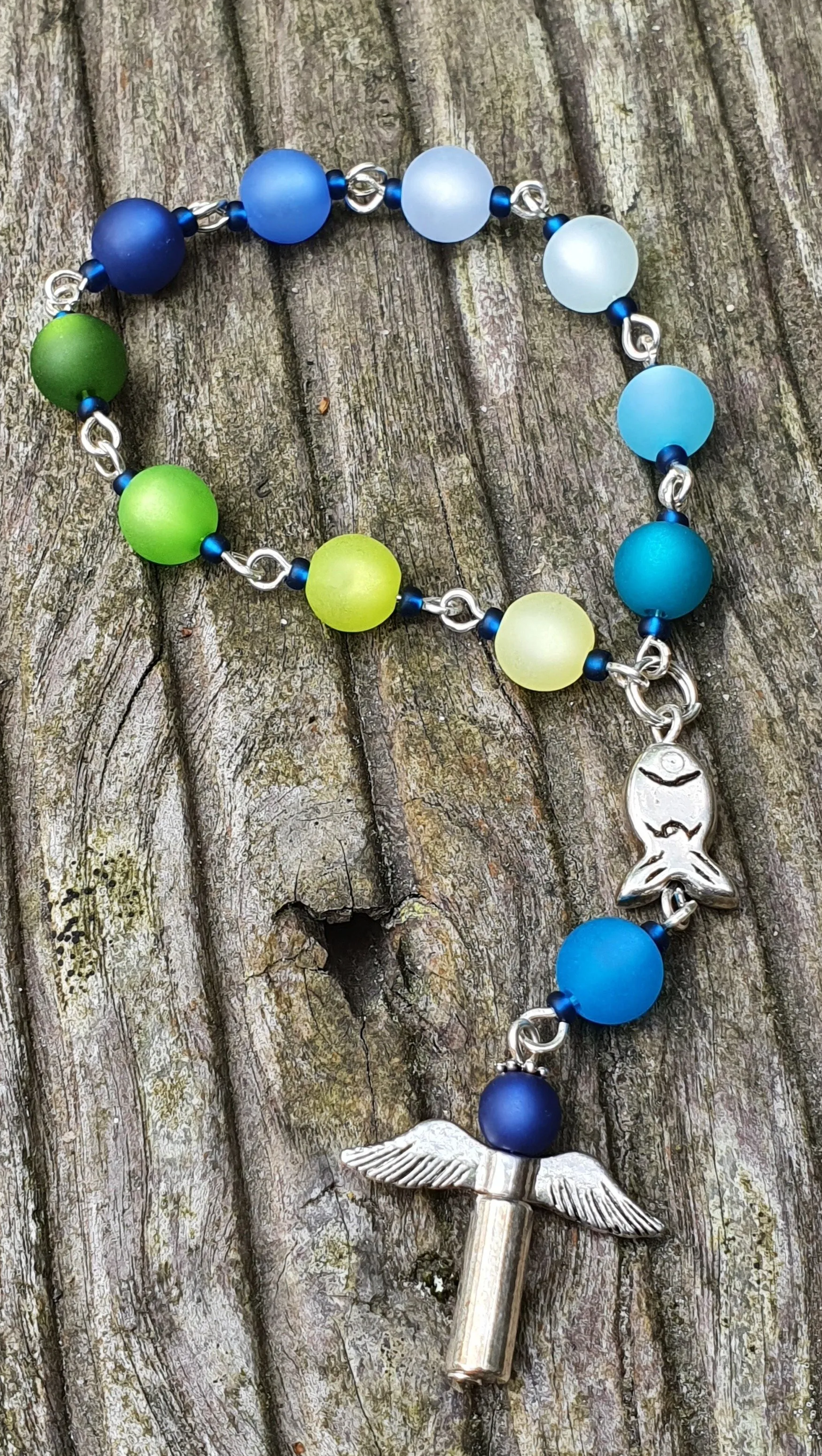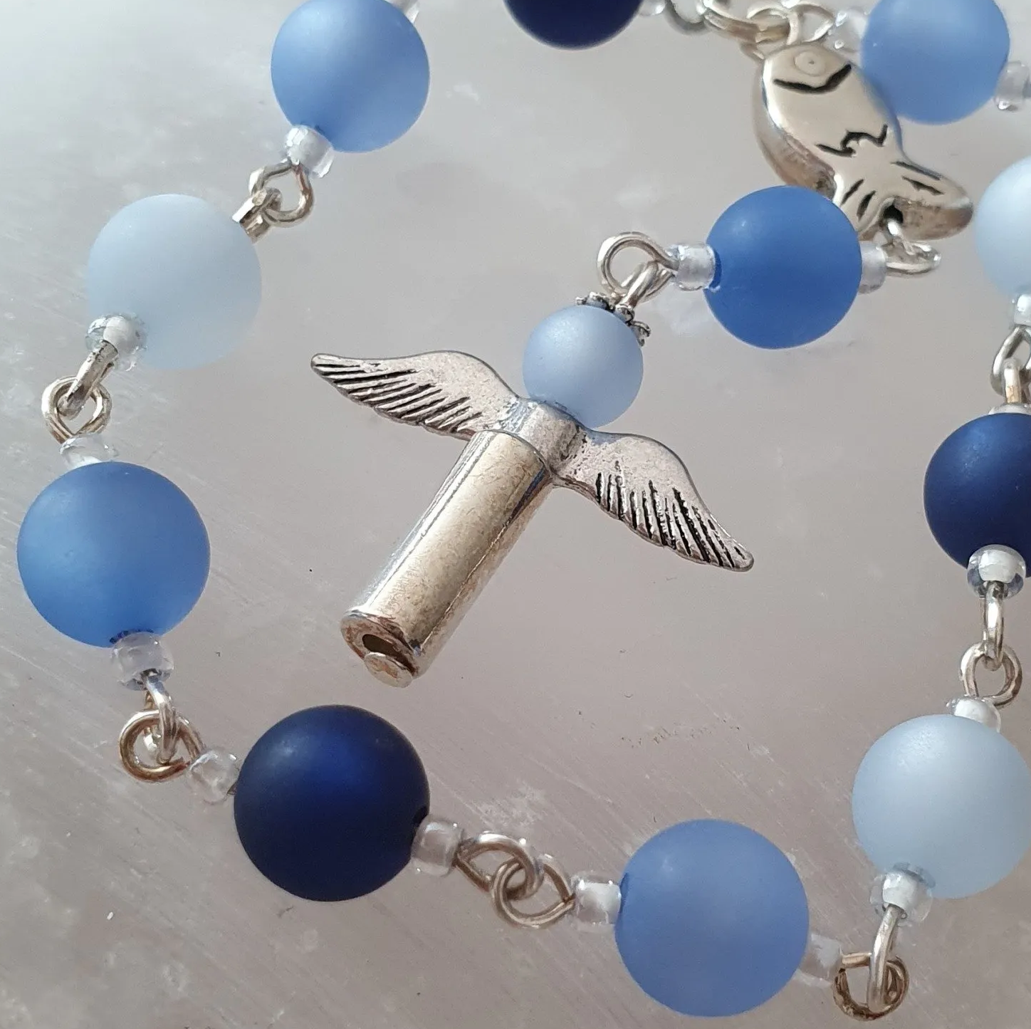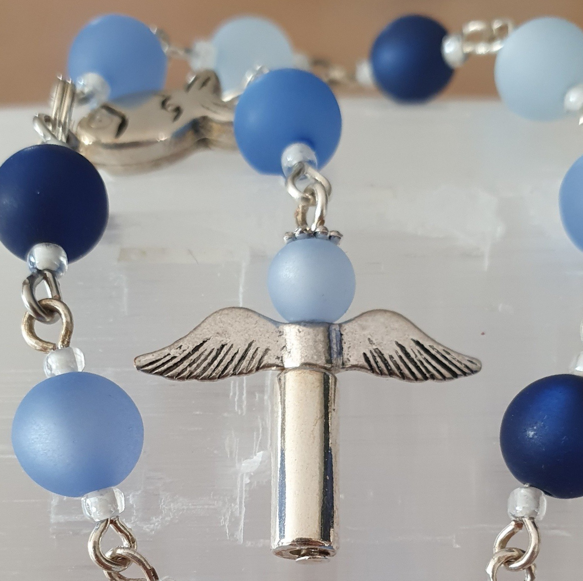 mit zwei kleinen Karabinern an, dann können Sie das untere Stück der Gebetskette abnehmen und nur den kleinen Engel in Kreuzform anhängen. Ihr Rosenkranz lässt sich so als Kette tragen und ist immer bei Ihnen. Oder sie tragen nur den kleinen Engel an einer feinen Silberkette. Eine Auswahl an Silberketten finden Sie in Kürze in meinem Online-Shop.